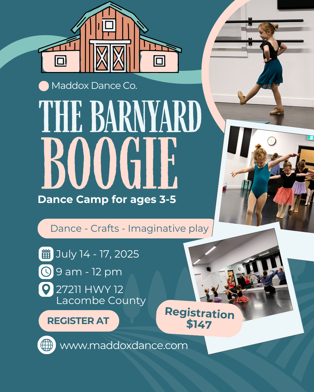 Giddy up and gallop on over to MDC for an exciting four days. We can’t wait to clap and stomp and spin while we also explore dancing like our barnyard friends. During our Barnyard Boogie Dance camp dancers will learn Ballet and Jazz terminology and general anatomy as well as practice skills that will foster body awareness, balance, and overall coordination. Each day, we will dance, make a craft, and read a story. We can’t wait for your little one to join us.